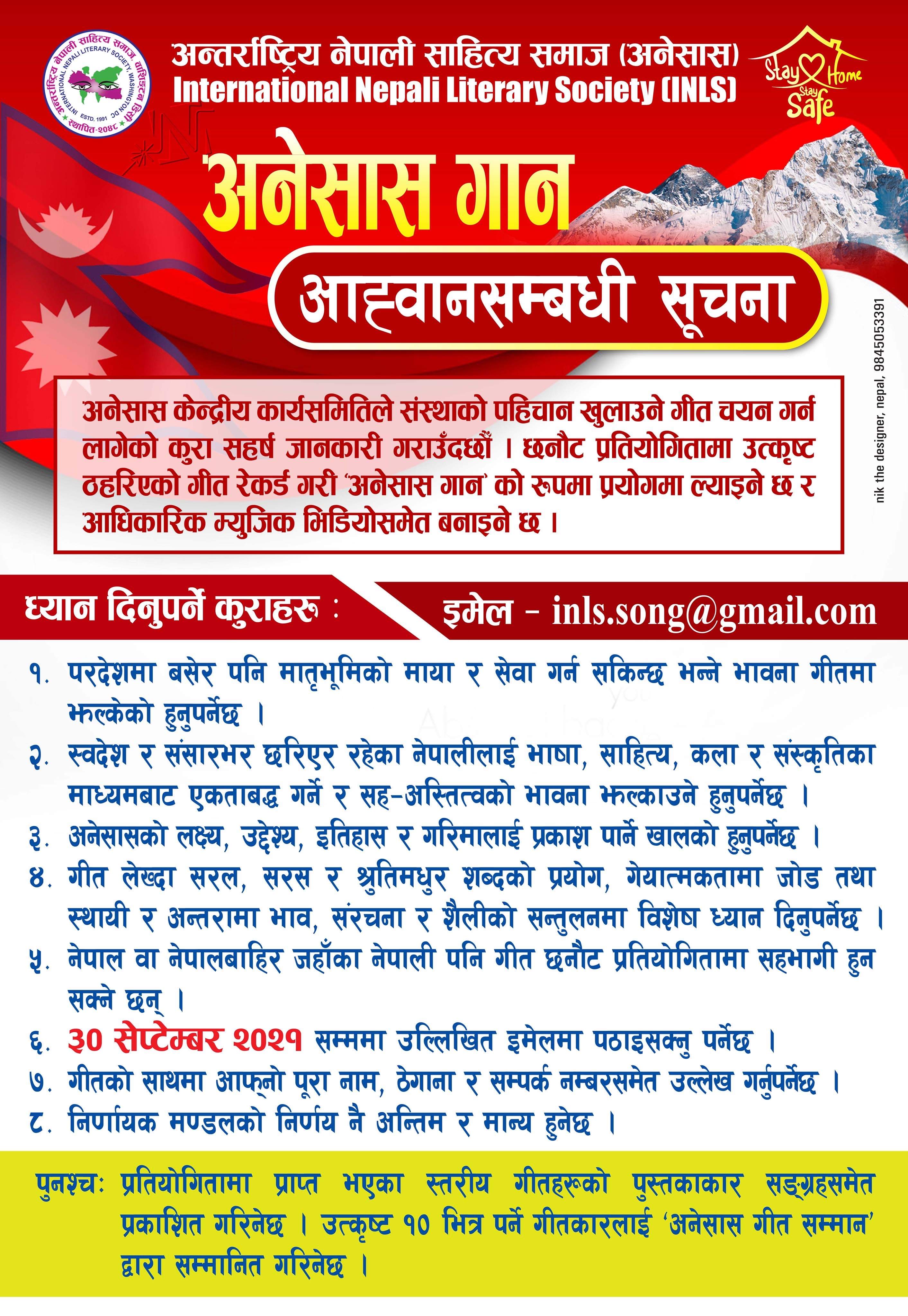अन्तर्राष्ट्रिय नेपाली साहित्य समाज (अनेसास) ले आधिकारिक गीत चयन गर्नका लागि सार्वजनिक रूपमा गीत (अनेसास गान) आव्हान गरेको छ । संस्था ३० वर्ष पुगेको अवसरमा संस्थाका लागि आधिकारिक गीतको आवश्यकता महसुस गरी सार्वजनिक रूपमा आव्हान गरिएको हाे ।